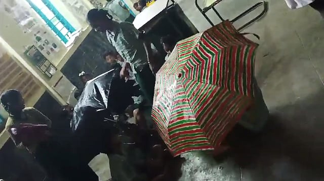அப்பகுதியில் இன்று அதிகாலை முதல் மழைபெய்து வந்ததால், பள்ளியின் வகுப்பறைக்குள் மழைநீர் ஒழுகியது. இதனால், பள்ளிக்கு சென்ற மாணவ, மாணவிகள் குடைபிடித்தபடி வகுப்பறையில் அமர்ந்திருந்தனர். மேலும், சாப்பிடக்கூடிய தட்டுகளை தண்ணீர் ஒழுகும் இடங்களில் வைத்தும் சமாளித்தனர். வகுப்பறைக்கு வந்து மழைநீரில் நனையாமல் இருக்க அங்கும் இங்குமாக ஓடுவதும், குடைபிடித்தபடியும் அமர்ந்துள்ளனர்.