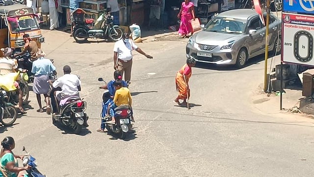 தமிழகம் முழுவதும் அக்னி நட்சத்திரம் காரணமாக வெயிலின் தாக்கம் அதிகரித்து காணப்படுகிறது. இதனால், முதியோர் வீட்டை விட்டு வெளியே வரவே அஞ்சுகின்றனர். இந்நிலையில், தென்காசி மாவட்டம் சங்கரன்கோவிலில் வயதான மூதாட்டி ஒருவர் கோயில் அருகே உள்ள நான்கு முக்கு சாலையைக் கடக்க முயன்றுள்ளார்.
