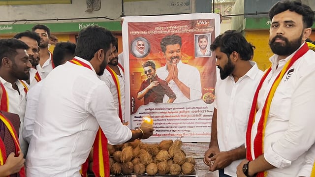 தவெக மத்திய மாவட்ட இளைஞரணி அமைப்பாளர் லோகேஷ் தலைமையில் நடைபெற்ற இந்த பூஜையில் 108 தேங்காய்கள் உடைத்தும், கிடா வெட்டியும், சுமார் 1,000 பேருக்கு அன்னதானம் வழங்கி வேண்டுதலை முன் வைத்தனர். தொடர்ந்து விஜய் படத்திற்கு பாலபிஷேகம் செய்து, திருஷ்டி சுற்றி, அப்பகுதியில் தமிழக வெற்றிக் கழகத்தின் கொடி ஏற்றினர். இந்த நிகழ்ச்சியில் தமிழக வெற்றி கழகத்தை சேர்ந்த நிர்வாகிகள் மற்றும் பொதுமக்கள் என ஏராளமானோர் கலந்து கொண்டனர்.