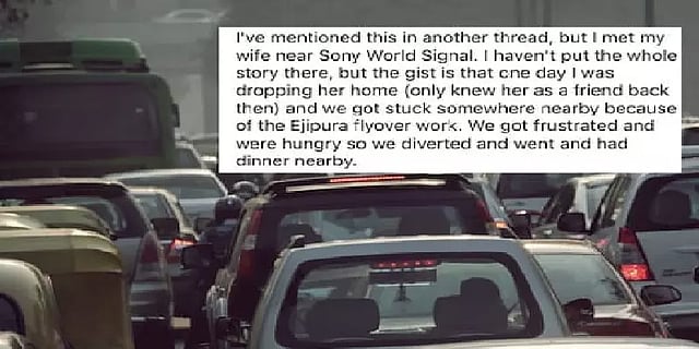 வைரலான பதிவில் அந்த நபர் பெங்களூரு டிராஃபிக் மலர்ந்த தன்னுடைய காதல் கதை குறித்து குறிப்பிட்டிருக்கிறார். அதில், அந்த நபர் தன்னுடைய மனைவியை சோனி வேர்ல்ட் சிக்னலில்தான் முதல் முதலாக சந்தித்திருக்கிறார். முதலில் நட்பாக மட்டுமே பழகி வந்ததால் சிக்னலில் சிக்கிக்கொள்ளாமல் இருக்க அவரை அடிக்கடி தன் பைக்கில் ஏற்றி ட்ராப் செய்வதை பழக்கமாக கொண்டிருந்திருக்கிறார்.