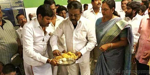 கொண்டாடியுள்ளனர். இந்த கொண்டாட்டத்தில் போது குழந்தைகளுக்கு தனது கையால் உணவு பரிமாரிய விஜயகாந்த், அவர்களுடன் சேர்ந்து பொங்கலையும் கொண்டாடினார்.