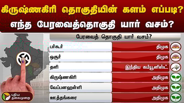 மக்களவைத் தேர்தல் நெருங்கி வரும் சூழலில் அரசியல் தலைவர்களின் தேர்தல் பரப்புரை தீவிரமடைந்து வருகிறது. இதற்கிடையே, கிருஷ்ணகிரி தொகுதியின் களம் எப்படி? எந்த பேரவைத்தொகுதி யார் வசம்? என்பதை இந்த வீடியோவில் பார்க்கலாம்.