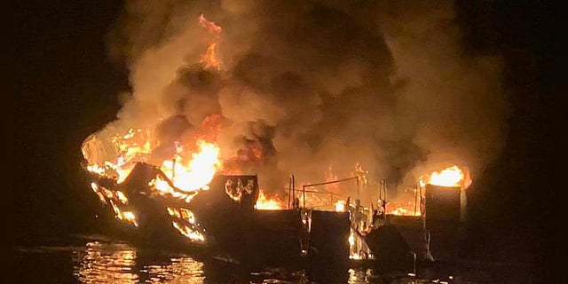 அமெரிக்காவின் கலிபோர்னியா மாகாணத்திலுள்ளது சான்டாகுரூஸ் தீவு. இங்கு கடலுக்கு அடியில் உள்ள பவளப்பாறை மற்றும் கடல்வாழ் உயிரினங்களை கண்டுகளிக்க ஏராளமான சுற்றுலா பயணிகள் படகுகளில் வந்து செல்வது வழக்கம். அங்கு ஸ்கூபா டைவிங்கிலும் நீச்சல் வீரர்கள் ஈடுபட்டு வந்தனர். இந்நிலையில் 38 பேர் கொண்ட குழு, படகில் அந்த தீவின் கடல்பகுதிக்கு கடந்த 2 ஆம் தேதி சென்றது. அப்போது, படகில் எதிர்பாராத விதமாக தீ விபத்து ஏற்பட்டது. இதையறிந்த கடலோர காவல் படையினர் விரைந்து வந்து தீயை போராடி அணைத்தனர். இருந்தாலும் இந்த தீ விபத்தில் 34 பேர் உயிரிழந்தனர்.