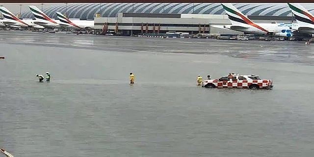 துபாயில் கனமழை பெய்து வருவதால் விமான ஓடுபாதைகள் நீரில் மூழ்கியுள்ளன. இதனால் விமான போக்குவரத்து பாதிக்கப்பட்டுள்ளது.