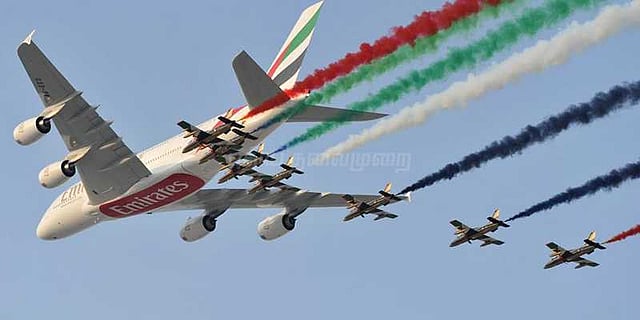 துபாயில் விமான கண்காட்சியை ஒட்டி நடந்த விமான சாகச நிகழ்ச்சி பார்வையாளர்களை வெகுவாக கவர்ந்தது.