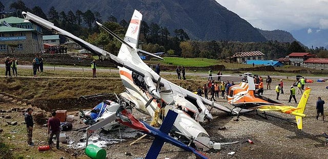 அப்போது திடீரென்று நிலைதடுமாறிய அந்த விமானம், அங்கு நின்றிருந்த ஹெலிகாப்டர்கள் மீது மோதியது. இதில், விமானம் கடுமையாகச் சேதமடைந்தது. சிறிய ரக விமானத்தில் இருந்த துணை விமானி துங்கனா, வெளியே நின்று கொண்டிருந்த உதவி சப் இன்ஸ்பெக்டர் ராம் பகதூர் கட்கா ஆகியோர் அந்த இடத்திலேயே உயிரிழந்தனர்.