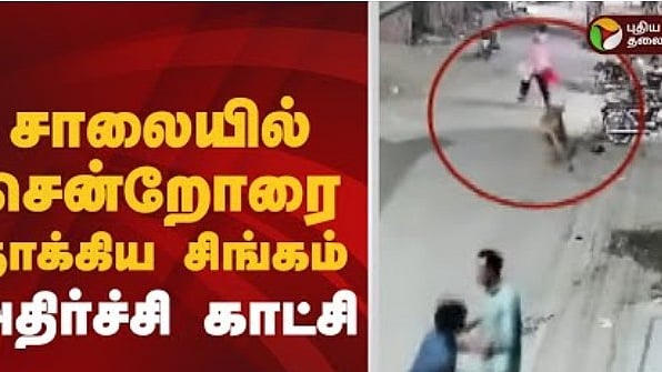 சாலையில் சென்றோரை தாக்கிய சிங்கம்.. அதிர்ச்சி காட்சி!