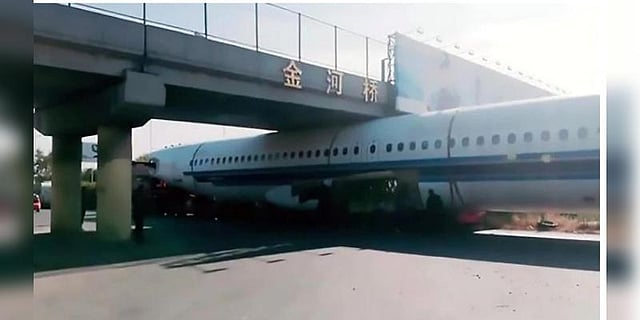 சீனாவில், விமானத்தின் பாகம் ஒன்று நீண்ட ட்ரக்கில் எடுத்துச் செல்லப்பட்டது. சாலை வழியாக எடுத்துச் செல்லப்பட்ட இந்த விமான பாகம், ஒரு பாலத்தின் அடியில் செல்லும்போது வசமாகக் சிக்கிக்கொண்டது. அதை அங்கும் இங்கும் நகர்த்த முடிய வில்லை. இதனால் விமானத்தின் பாகத்தை எப்படி வெளியே எடுப்பது என்பது குறித்து தெரியாமல் தவித்தனர். இதனிடையே டிரக்கின் டயரை கழற்றினாலோ அல்லது பஞ்சார் செய்தாலோ மட்டுமே விமானத்தின் பாகத்தை நகர்த்த முடியும் என்று சிலர் தெரிவித்துள்ளனர்.