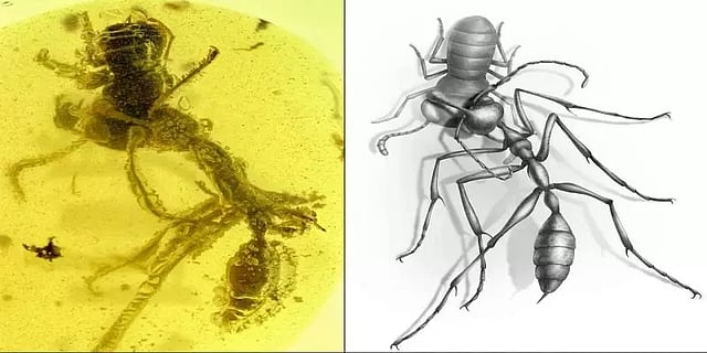 கிரெட்டேசியஸ் காலத்தில் வாழ்ந்த வேட்டையாடும் ‘நரக எறும்பு’ (ஹைடோமெர்மெசின்) ஒன்று, அழிந்துபோன கரப்பான் பூச்சி இனமான கபுடோராப்டர் எலிகன்ஸ் என்ற பூச்சியை வேட்டையாடும் படிவம் அது.
