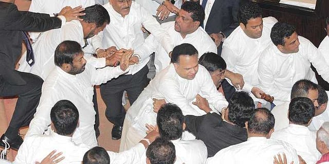 இதையடுத்து ராஜபக்ச பேசிய போது அவரது ஆதரவு எம்பிக்களுக்கும், ரணில் ஆதரவு எம்பிக்களுக்கும் இடையே வாக்குவாதம் ஏற்பட்டு கைகலப்பாக மாறியது. எம்பிக்கள் அவையிலேயே ஒருவரையொருவர் சரமாரியாக தாக்கிக் கொண்டனர். அப்போது ரணில் விக்கிரமசிங்கவின் ஐக்கிய தேசியக் கட்சி எம்.பி. பாலித்த தேவபெரும, தான் வைத்திருந்த கத்தியை வெளியே எடுத்தார். அவர் கையில் கத்தியுடன் நாடாளுமன்றத்தில் நடமாடும் புகைப்படங்கள் தற்போது வெளியாகி உள்ளன. எம்.பி. ஒருவர் நாடாளுமன்றத்திற்கு கத்தி எடுத்துச் சென்றது பரபரப்பை ஏற்படுத்தியது. இந்நிலையில் அவர் கத்தியுடன் நாடாளுமன்றத்தில் வந்ததற்காக கைது செய்யப்பட்டார்.
