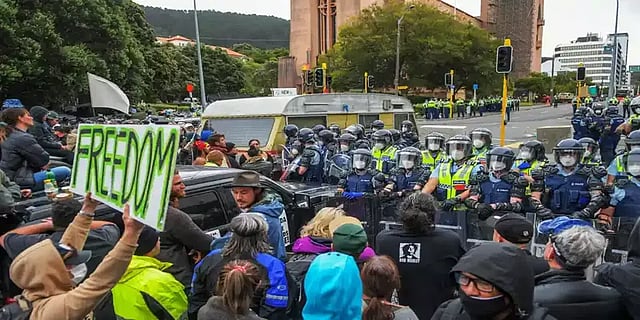 தடுப்பூசி மற்றும் முகக்கவசம் கட்டாயம் என்பன உள்ளிட்ட கொரோனா தடுப்பு விதிமுறைகளை நீக்க வலியுறுத்தி, கடந்த 20 நாட்களாக வெலிங்டனில் உள்ள நாடாளுமன்றத்தை ஆர்ப்பாட்டக்காரர்கள் முற்றுகையிட்டு வந்தனர். இந்நிலையில், கட்டடத்திற்குள் நுழைய முயன்ற அவர்களை காவல்துறையினர் தடுத்தபோது, இரு தரப்புக்கும் இடையே தள்ளுமுள்ளு ஏற்பட்டது. பின்னர் போராட்டத்தில் ஈடுபட்டவர்களை காவல்துறையினர் கைது செய்தனர். போராட்டக்காரர்களின் வாகனங்களையும் பறிமுதல் செய்தனர்.
