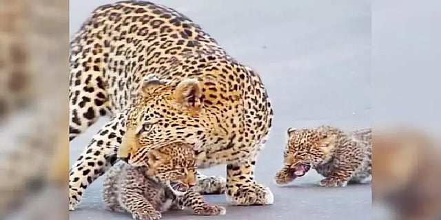 தாய் சிறுத்தை ஒன்று தன் குட்டிகளை பத்திரமாக சாலையைக் கடக்க வைத்து அழைத்துச் செல்லும் வீடியோ இணையத்தில் வைரைலாகி வருகிறது.