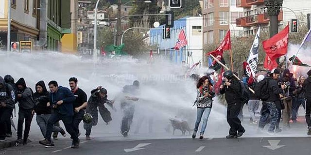 சிலி நாட்டில் 1973 ஆம் ஆண்டு ஆட்சி கவிழ்க்கப்பட்டதைத் தொடர்ந்து நடைபெற்ற சர்வாதிகார ஆட்சியில் உயிரிழந்தவர்களுக்கு அஞ்சலி செலுத்துவதற்காக ஏராளமானோர் பேரணியாக சென்று கொண்டிருந்தனர். அப்போது, கூட்டத்தில் இருந்தவர்கள் கற்களையும், பாட்டில்களையும் காவல்துறையினர் மீது வீசி தாக்குதல் நடத்தினர். இதையடுத்து, கூட்டத்தைக் கலைக்க காவல்துறையினர் தண்ணீரை பீய்ச்சியடித்தும், கண்ணீர் புகை குண்டுகளையும் வீசினர். இதனால் அப்பகுதி போர்க்களம் போல் காட்சியளித்தது. சிலியில் 1973 முதல் 1990 வரையிலான சர்வதாதிகார ஆட்சியில் 3 ஆயிரத்து 200 பேர் கொல்லப்பட்டனர். 28 ஆயிரம் பேர் கொடுமைப்படுத்தப்பட்டனர்.