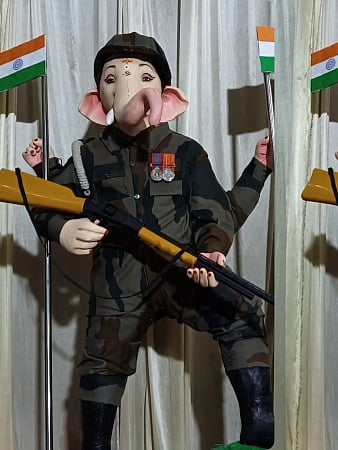 விநாயகர் சிலைக்கு ராணுவ தொப்பி அணிந்தபடி பாதுகாப்பு எல்லையில் கம்பீரமாக விநாயகர் ராணுவ உடையில் நிற்பது போல் உருவாக்கப்பட்டுள்ளது.