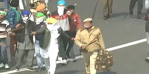 டெல்லி வன்முறையில் போராட்டக்காரர்களிடையே தனியாக சிக்கிய போலீசை விவசாயிகள் சிலர் பாதுகாத்து காப்பாற்றிய வீடியோ வைரலாகி வருகிறது