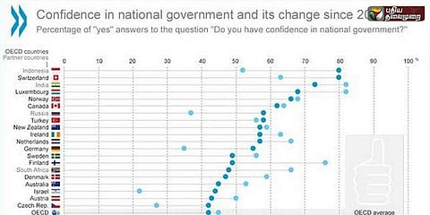 ஒவ்வொரு நாட்டின் மக்கள், அவர்கள் அரசின் மீது எவ்வளவு நம்பிக்கை வைத்திருக்கிறார்கள் என்று ஓஇசிடி (பொருளாதார ஒத்துழைப்பு மற்றும் அபிவிருத்தி அமைப்பு) என்ற அமைப்பு உலக அளவில் கணக்கெடுப்பு ஒன்றை நடத்தியது. இந்த கணக்கெடுப்பின் முடிவை ஓஇசிடி அறிவித்தது. அந்த புள்ளி விவரத்தின் அடிப்படையில் 73 சதவீத மக்கள் நம்பிக்கையுடன் இந்தியா மூன்றாம் இடத்தில் உள்ளது. 80 சதவீத மக்கள் நம்பிக்கையுடன் இந்தோனேசியாவும், ஸ்விட்சர்லாந்தும் முதலாம் இடத்தில் இருக்கின்றன.