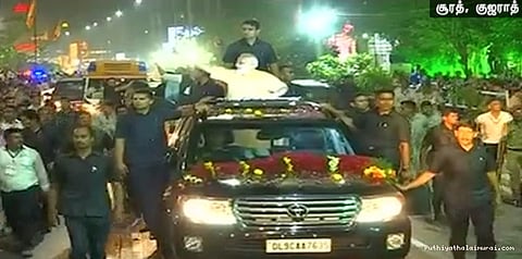 பிரதமர் மோடி தனது சொந்த மாநிலமான குஜராத்துக்கு சென்றுள்ளார். அவரை வரவேற்கும் விதத்தில் 11 கிலோ மீட்டர் தொலைவு வரை நடைபெற்ற இருச்சக்கர வாகன பேரணியை அவர் பார்வையிட்டார். பிரதமர் வருகைக்கு முன்னதாக, சூரத்தில் அமைக்கப்பட்டுள்ள அவரது உருவச் சிலைக்கு ஹெலிகாப்டர்கள் மூலம் மலர்கள் தூவப்பட்டன.
