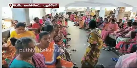 புதுச்சேரியில் உள்ள குபேர் அங்காடியில் மொத்தமாக மீன்கள் ஏலம் விடுவதற்கு மாவட்ட ஆட்சியர் தடை விதித்தற்கு எதிர்ப்பு தெரிவித்து மீனவ பெண்கள் விற்பனையில் ஈடுபடாமல் தர்ணாவில் ஈடுபட்டுள்ளனர்.