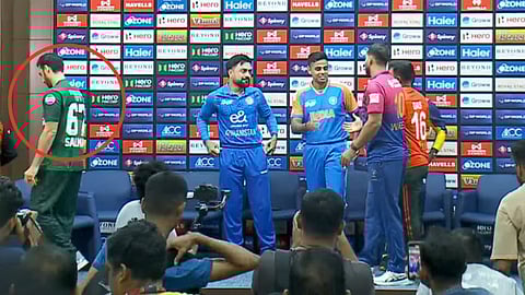 இந்த சூழலில் 8 அணிகளும் பங்கேற்ற செய்தியாளர் சந்திப்பு நேற்று தொடர் தொடங்குவதற்கு முன்னர் நடைபெற்றது. அதில் பங்கேற்ற இந்திய கேப்டன் மற்றும் பாகிஸ்தான் கேப்டன் இருவரும் கைக்குலுக்கவில்லை என்ற தகவல் வேகமாக பரவி சர்ச்சையை கிளப்பியது.