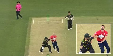 ஆஸ்திரேலியா - இங்கிலாந்து இடையேயான டி20 போட்டியில் பவுலரின் கைக்கு வந்த கேட்ச்சை பிடிக்க விடாமல் மேத்யூ வேட் தடுத்த சம்பவம் சர்ச்சையை ஏற்படுத்தியுள்ளது.