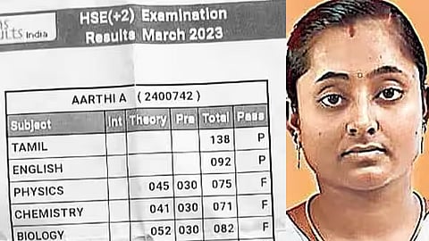 அந்த வகையில் மதுரை மாவட்டம் சூரக்குளம் பகுதியைச் சேர்ந்த ஆர்த்தி என்னும் மாணவி 2021ஆம் ஆண்டு 11ஆம் வகுப்பு தேர்ச்சி அடைந்திருந்தார். இந்த நிலையில் குடும்ப சூழ்நிலை காரணமாக 12 ஆம் வகுப்பு தொடர முடியாமல் இந்த ஆண்டு தனியார் மூலம் பொது தேர்வு எழுத அனுமதி பெற்று எழுதியிருந்தார். இந்த நிலையில் திருமங்கலம் பிரான்சிஸ் பள்ளியில் ஆர்த்தி பொதுத்தேர்வு எழுதியிருந்தார். நேற்று முன்தினம் முடிவு வெளியான நிலையில் ஆர்த்தி தேர்வு முடிவு பார்த்து வீட்டிலிருப்போர் அதிர்ச்சி அடைந்தனர்.
