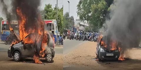 காரைக்குடி: நடுரோட்டில் திடீரென தீ பிடித்து பற்றி எரிந்த கார்