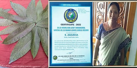 மா இலைகளில் 1330 திருக்குறளை எழுதி சாதனை படைத்த திருச்சி அரசுபள்ளி ஆசிரியை