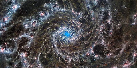 பூமியிலிருந்து 3.2 கோடி ஒளியாண்டுகள் தொலைவில் இருக்கும் M74 என்கிற சுருள் வடிவ பாண்டம் கேலக்ஸியை படம் எடுத்துள்ளது ஜேம்ஸ் வெப் தொலைநோக்கி. சூரியன் போன்ற நட்சத்திரங்களின் உருவாக்கம் இப்புகைப்படங்களில் தெளிவாக வெளிப்பட்டுள்ளதாக நாசா விளக்கம் அளித்துள்ளது. ஜேம்ஸ் வெப் தொலைநோக்கியின் கூர்மையான பார்வைத்திறனால் அந்த கேலக்ஸியின் மையத்தில் இருந்து வெளிவரும் பிரமாண்டமான சுழல் கரங்களில் வாயு மற்றும் தூசியின் மென்மையான இழைகளை துல்லியமாக படம்பிடித்திருக்கிறது.
