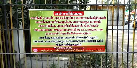 “வாக்குகளுக்கு பணம் கொடுப்பது தேசவிரோதம்”- மதுரையில் குடியிருப்பு வாசிகள் எச்சரிக்கை பலகை!