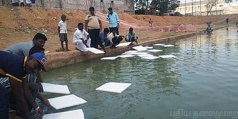 நூதன முறையில் அங்குள்ள குளத்தில் தெர்மோகோல் அட்டைகளை விட்டு தங்களின் எதிர்ப்பை பதிவு செய்தனர்.
