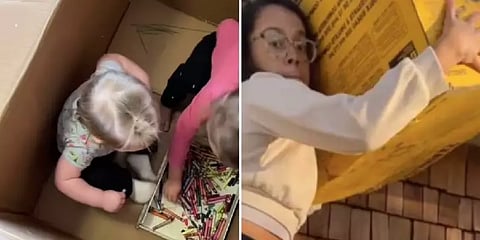 அமெரிக்காவின் ஓக்லஹோமா பகுதியைச் சேர்ந்த இரண்டு பெண் குழந்தைகளுக்கு தாயான கேப்ரியல் டன் என்ற பெண், வீட்டில் இருக்கும் வேலைகளை முடிப்பதற்காக ஒரு அட்டைப்பெட்டிக்குள் சில க்ரெயான்ஸ் கலர் பென்சில்களையும் போட்டு இரு மகள்களையும் அதில் அடைத்திருக்கிறார்.