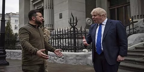 உக்ரைன் நாட்டுக்கு சென்ற பிரிட்டன் பிரதமர் போரிஸ் ஜான்சன், கீவ் நகரின் வீதியில் நடந்து சென்றபடி அந்நாட்டு அதிபர் செலன்ஸ்கியிடம் போர் நிலவரம் குறித்து பேசினார்.